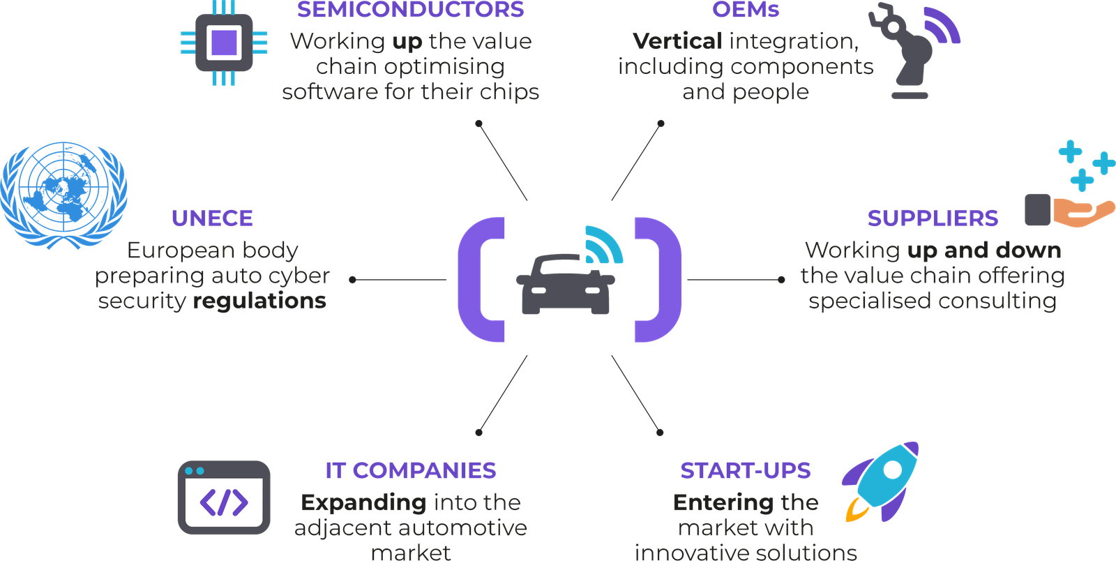 • Compliance and regulatory guidance: We provide expert guidance and support to ensure compliance with industry-specific cybersecurity regulations and standards, such as ISO/SAE 21434, UN R155, and the Automotive Cybersecurity Best Practices published by organizations such as the Auto-ISAC (Automotive Information Sharing and Analysis Center).